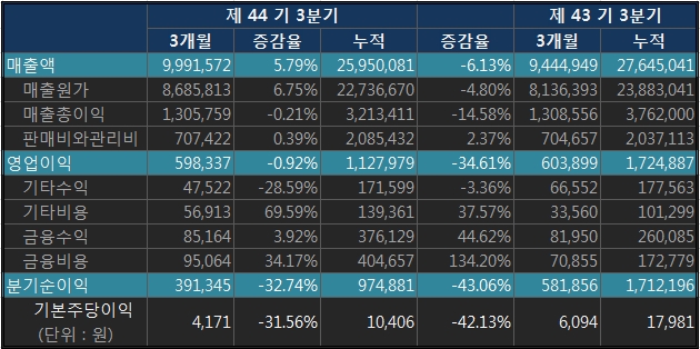 11월 16일 20년 3분기 실적 공시했습니다.2020년 3분기 매출은 99,916억원, 영업 이익은 5,983억원을 달성했습니다. 전년 대비 매출은 5.8% 늘어난 반면 영업 이익은 소폭 감소(-0.9%) 했습니다. 현대·기아 차의 합계 생산이 3.3%감소했음에도 불구하고 전기 차를 포함한 친환경 차 생산 증가(35.3%)와 중대형/SUV차종의 생산 증가로 매출이 늘었으나 올해 초부터 시작된 코로나 19의 영향으로 글로벌 수요 감소로 애프터 서비스 부문이 전년 대비 5.1% 줄었고 전체 영업 이익이 감소했습니다.