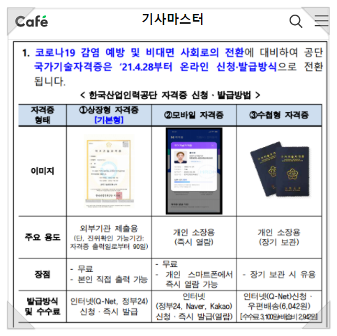 그래서 오늘은 큐넷 자격증 사본과 발급방법, 비용에 대해 알아보려고 합니다!큐넷 자격증의 종류를 알아보는 큐넷 자격증은 상장형, 수첩형, 모바일의 3가지 형태로 발급이 가능합니다.