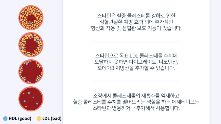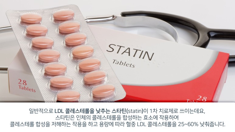 일반적으로 LDL 콜레스테롤을 낮추는 스타틴이 1차 치료제로 사용되지만 스타틴은 인체의 콜레스테롤을 합성하는 효소에 작용해 콜레스테롤 합성을 저해하는 작용을 하며 용량에 따라 혈중 LDL 콜레스테롤을 25~60% 낮춰줍니다.
