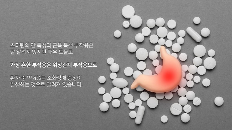 스타틴의 간독성과 근육독성의 부작용은 잘 알려져 있으나 매우 드물고 가장 일반적인 부작용은 위장관계의 부작용으로 환자 중 약 4%는 소화장애 증상이 발생하는 것으로 알려져 있습니다.