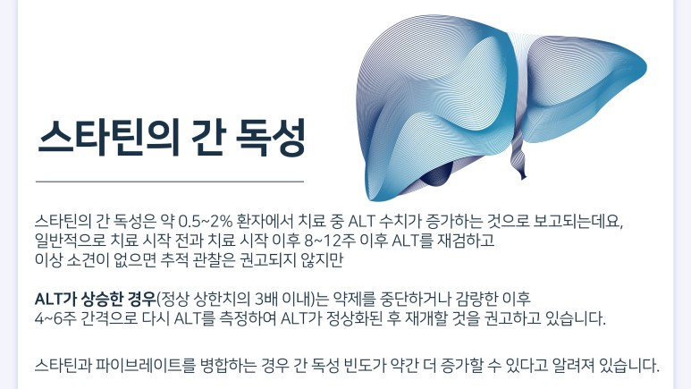 스타틴의 간독성은 약 0.5~2%의 환자에서 치료 중 ALT 수치가 증가하는 것으로 보고되는데, 일반적으로 치료 시작 전과 치료 시작 후 8~12주 이후 ALT를 재검사하고 이상 소견이 없으면 추적 관찰이 권고되지 않지만, ALT가 상승한 경우(정상 상한치의 3배 이내)는 약제를 중단하거나 감량한 후 4~6주 간격으로 다시 ALT를 측정하여 ALT가 정상화된 후 재개할 것을 권고하고 있습니다.