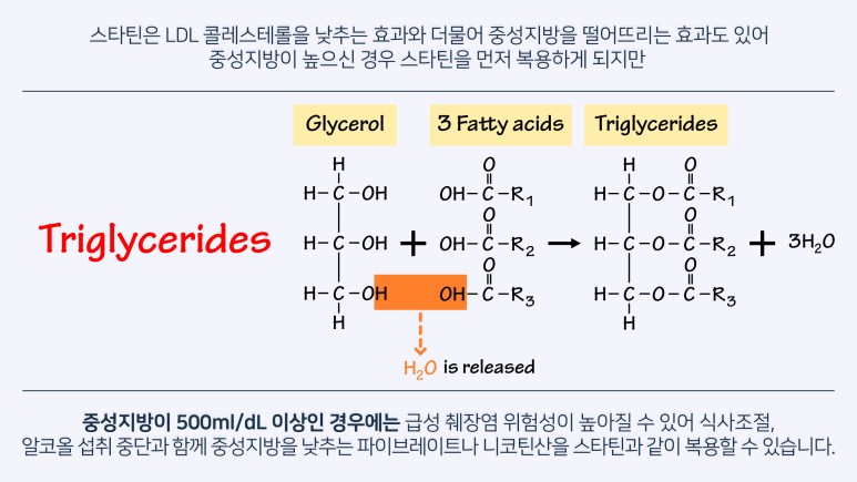스타틴은 LDL 콜레스테롤을 낮추는 효과와 함께 중성지방을 떨어뜨리는 효과도 있어 중성지방이 높을 경우 스타틴을 먼저 복용하게 되지만 중성지방이 500ml/dL 이상인 경우에는 급성 췌장염 위험이 높아질 수 있어 식사조절, 알코올 섭취 중단과 함께 중성지방을 낮추는 파이브레이트나 니코틴산을 스타틴과 함께 복용할 수 있습니다.