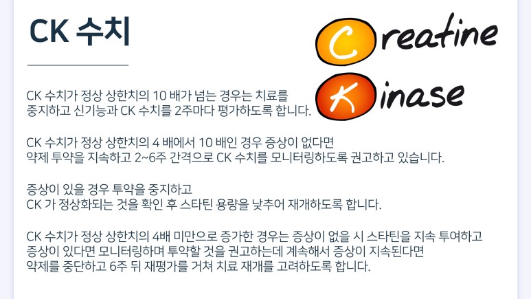 CK 수치가 정상 상한치의 10배가 넘을 경우 치료를 중단하고 새로운 기능과 CK 수치를 2주마다 평가하도록 합니다.CK 수치가 정상 상한치의 4배에서 10배일 경우 증상이 없으면 약제 투약을 지속하고 2~6주 간격으로 CK 수치를 모니터링하도록 권고하고 있습니다.