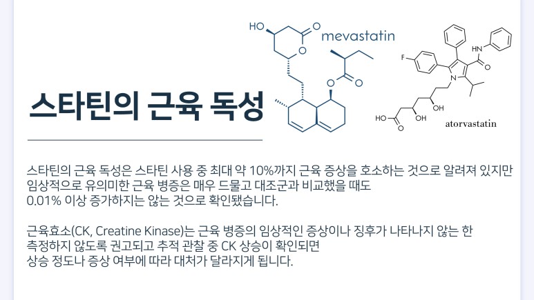 스타틴의 근육독성은 스타틴 사용 중 최대 약 10%까지 근육 증상을 호소하는 것으로 알려져 있으나 임상적으로 유의미한 근육병증은 매우 드물고 대조군과 비교해도 0.01% 이상 증가하지 않는 것으로 확인되었습니다.