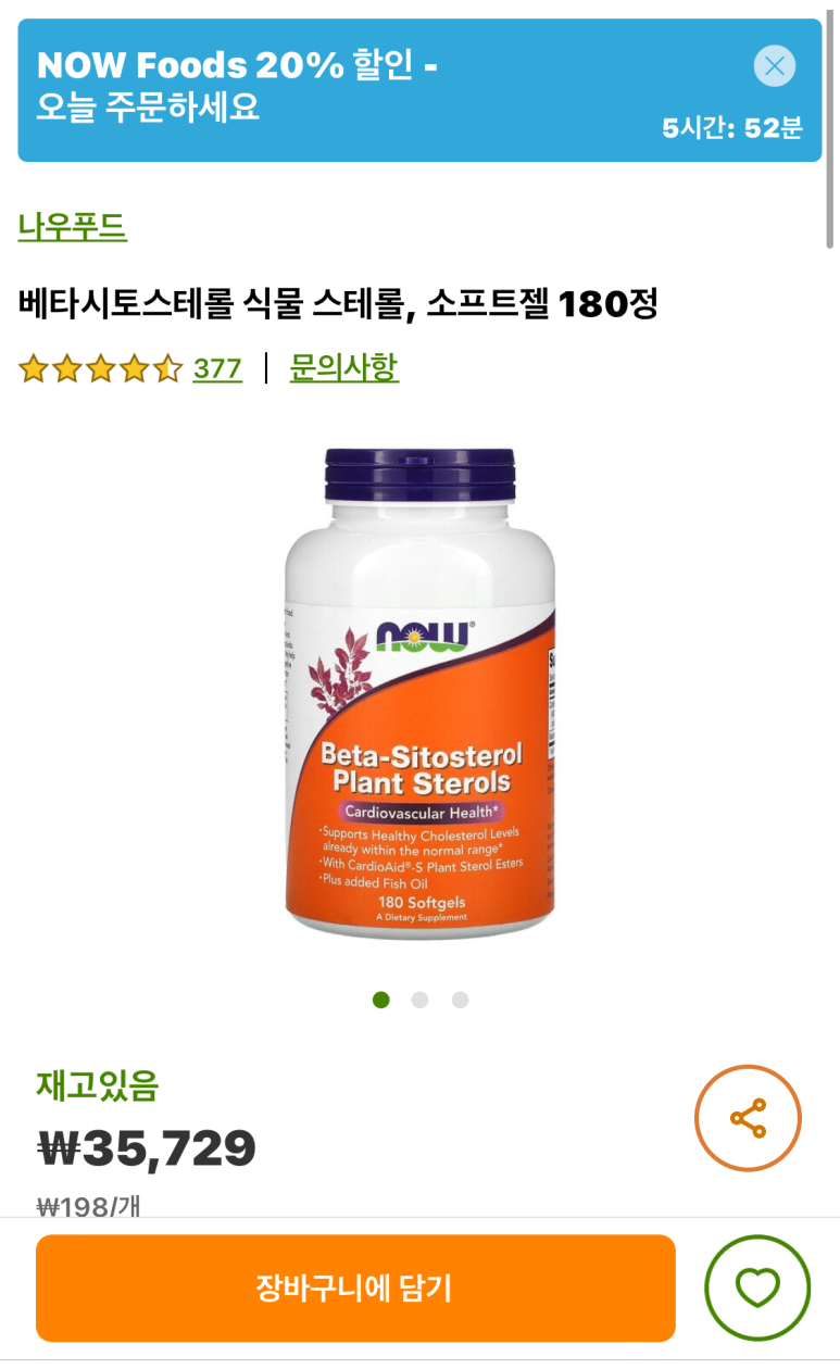 플랜트 스테롤(Plant sterol). 말 그대로 식물에서 뽑아낸 콜레스테롤로 생각하면 간단할 것이다.야채와 견과류를 많이 먹으면 자연스럽게 먹을 수 있기 때문에 혈중 콜레스테롤 수치를 낮추는 데 도움이 된다.직구를 통해 얻을 수 있어서 나는 아이허브 앱에서 구입했다. 아이허브는 검색만 해도 할인코드가 나오므로 잘 찾아 구입하기 때문에 NOW 20 NOW 20 NOW를 입력해 20% 할인받았다.