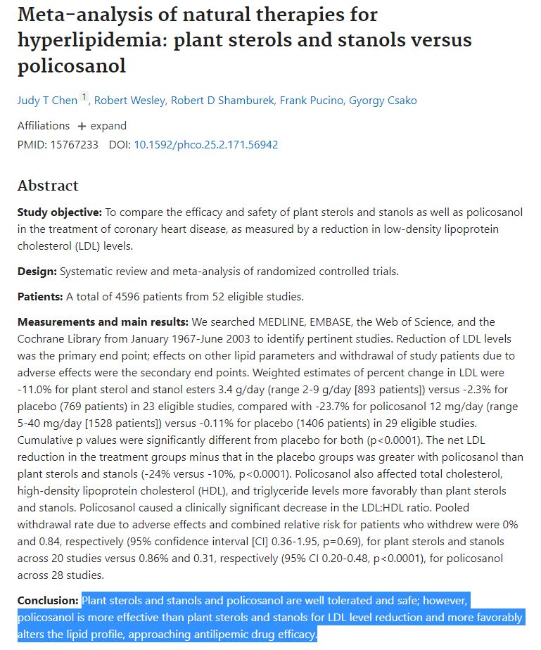 이 메타분석을 보면, 폴리코사놀과 프랑스스테롤이 콜레스테롤 수치를 낮추는 것은 알려져 있으며, 두 가지 성능 비교를 한 논문을 분석했다. 결과는 폴리코사놀 쪽이 효과가 있다고 한다.