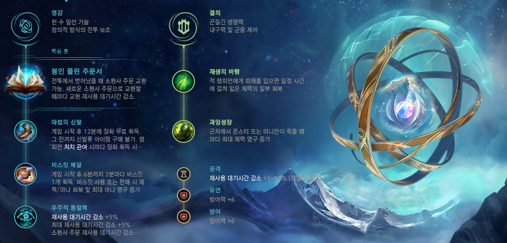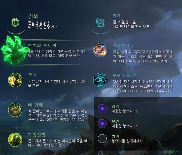 오른쪽은 패시브를 활용하여 아이템을 제작할 수 있는 챔피언입니다. 라인전을 계속할 수도 있고, 게임 막판 아군을 더욱 강하게 만들 수도 있습니다. 뿐만 아니라 강력한 CC를 보유하여 이니시에이팅과 적의 지속적인 방해에 뛰어난 챔피언입니다.