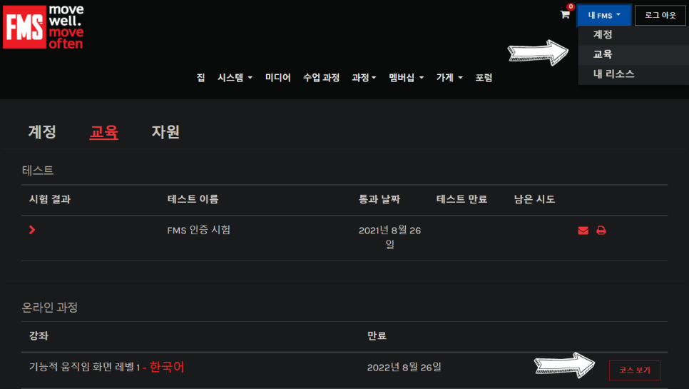우측 상단의 ‘교육’을 클릭하시고 우측 하단의 ‘코스보기’를 클릭하시면 교육을 들으실 수 있습니다.FMS 공부방법