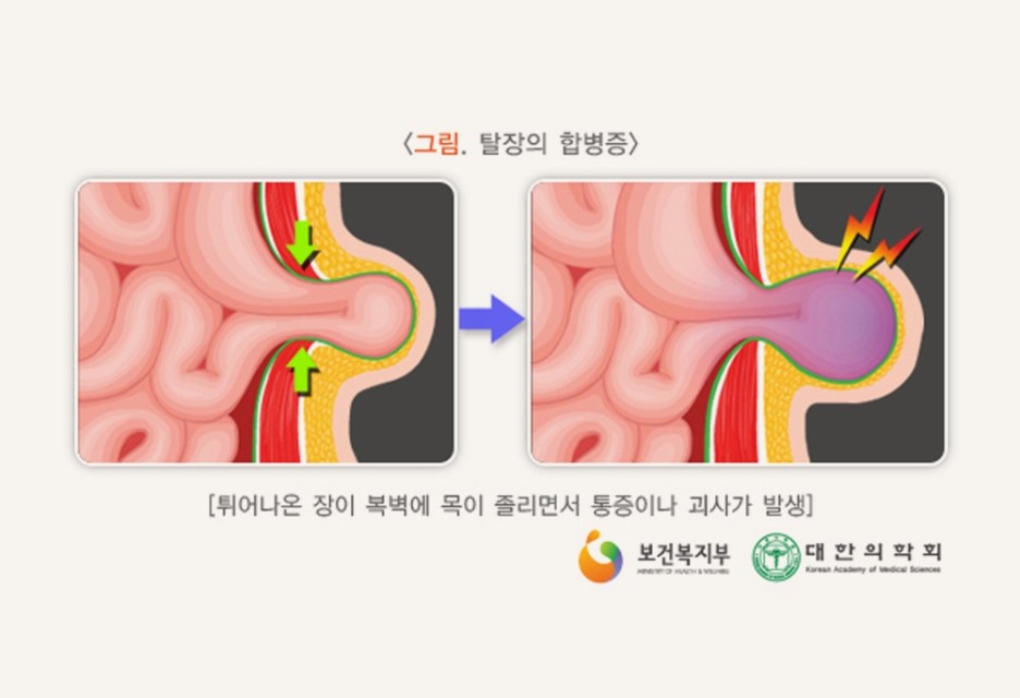 가끔 튀어나온 장기가 제자리에 돌아가지 못하고 조여 혈액순환이 잘 되지 않아 조직이 괴사하고 장폐색이 될 수 있는데, 그런 경우는 수술이 불가피합니다.