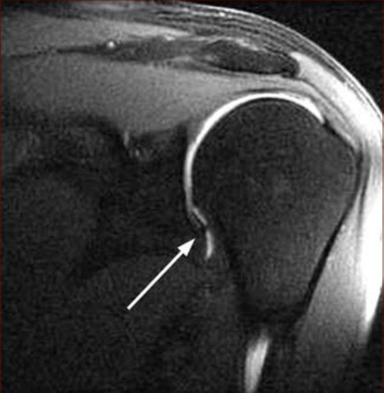 50견 환자의 수축캡슐과 하부소실을 보인 MRI