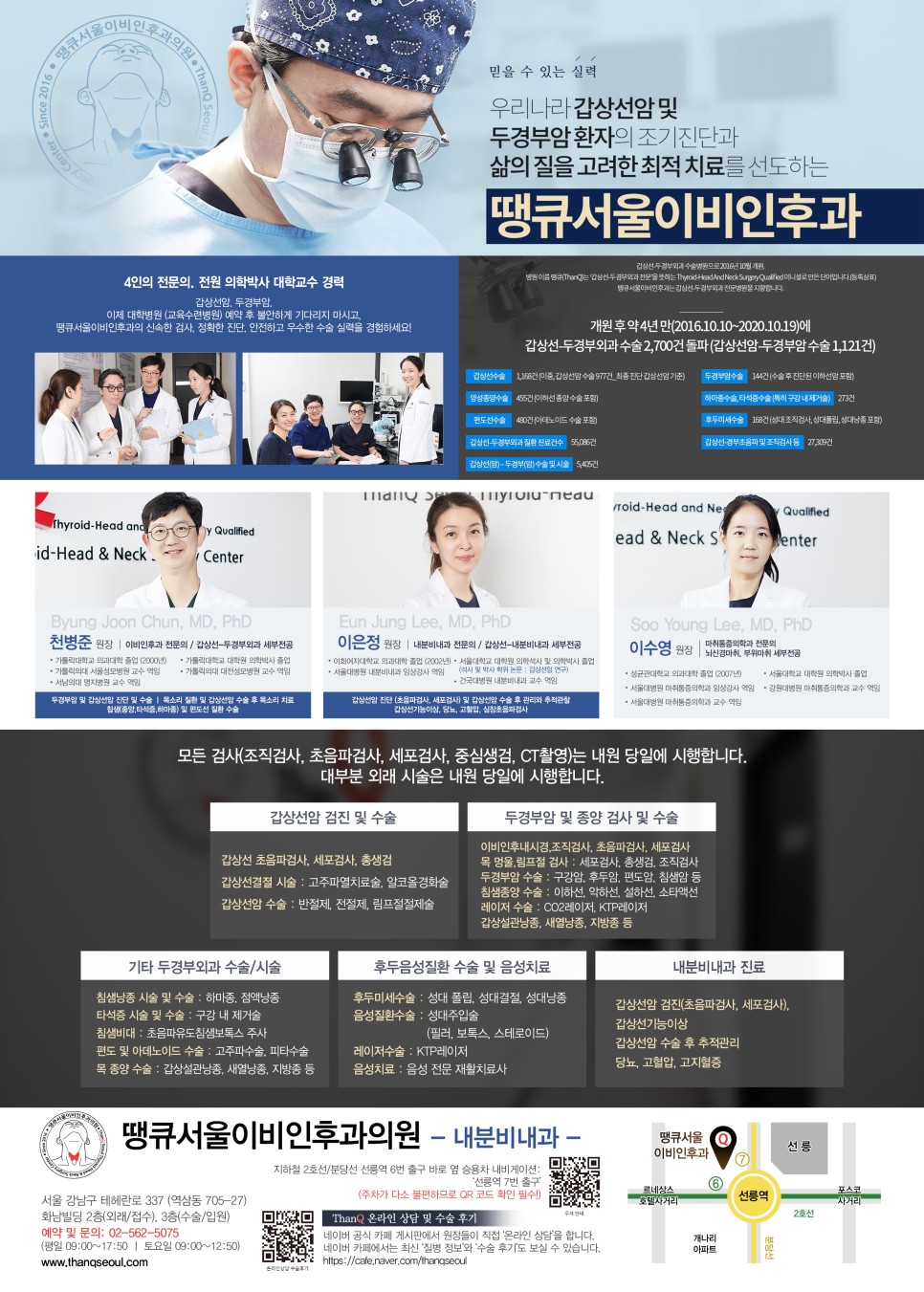 갑상선암, 두경부암(구강암, 후두암, 인두암, 타액선암) 환자를 위한 땡큐서울이비인후과-갑상선외과.내과카페 cafe.naver.com 갑상선암, 갑상선질환, 구강암, 타액선암, 후두암, 편도선, 목소리 thanqseoul.modoo.at 땡큐서울이비인후과, 하정훈 교수, 갑상선암, 타액선종양, 목소리 headandneck.co.kr 땡큐서울이비인후과의원 서울특별시 강남구 테헤란로 337 화남빌딩 2층, 3층 (선릉역 6번출구) 대표자 : 하정훈 대표전화 : 02-562-5075 COPYROTOPYDHQHITS RESERVED.thyroidcancer.co.kr