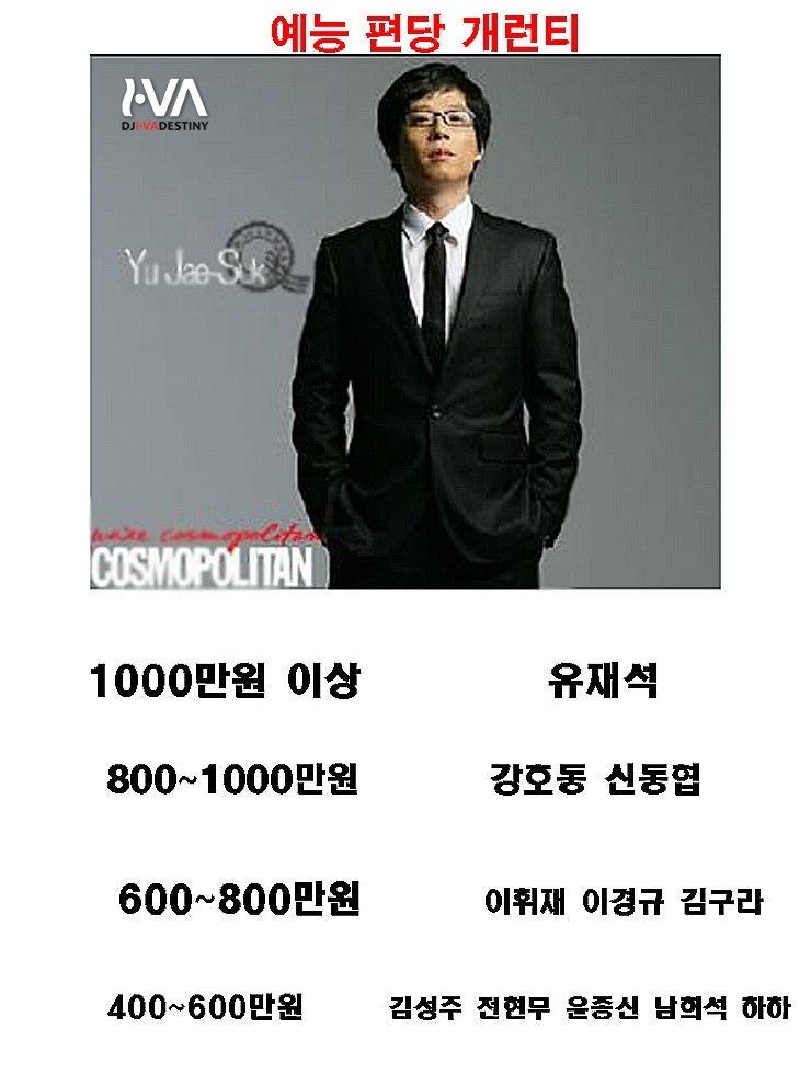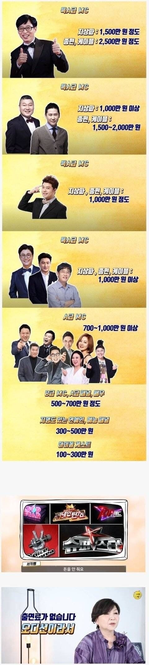 (연예인 회당 출연료), 연예인별 회당 출연료(유재석, 강호동, 신동엽, 김구라, 김성주, 정영무, A급, B급, 아이돌 출연료) 연예인 회당 출연료, 연예인별 회당 출연료(유재석, 강호동, 신동엽, 김구라, 김성주, 정영무, A급, B급, 아이돌 출연료)