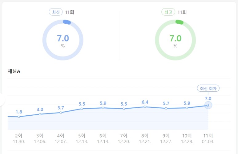 그래도 그 장면이 제일 사이다여서 기억에 남는데, 오늘 아침에 시청률을 확인해서 정말 놀랐다는….. 최고 시청률인 7%를 기록했던 것이다. 와… 정말… 아무래도 사람 같다는 건 누가 범인이고 쇼윈도 결말이 어떻게 될지 다들 궁금해하는 것 같다.