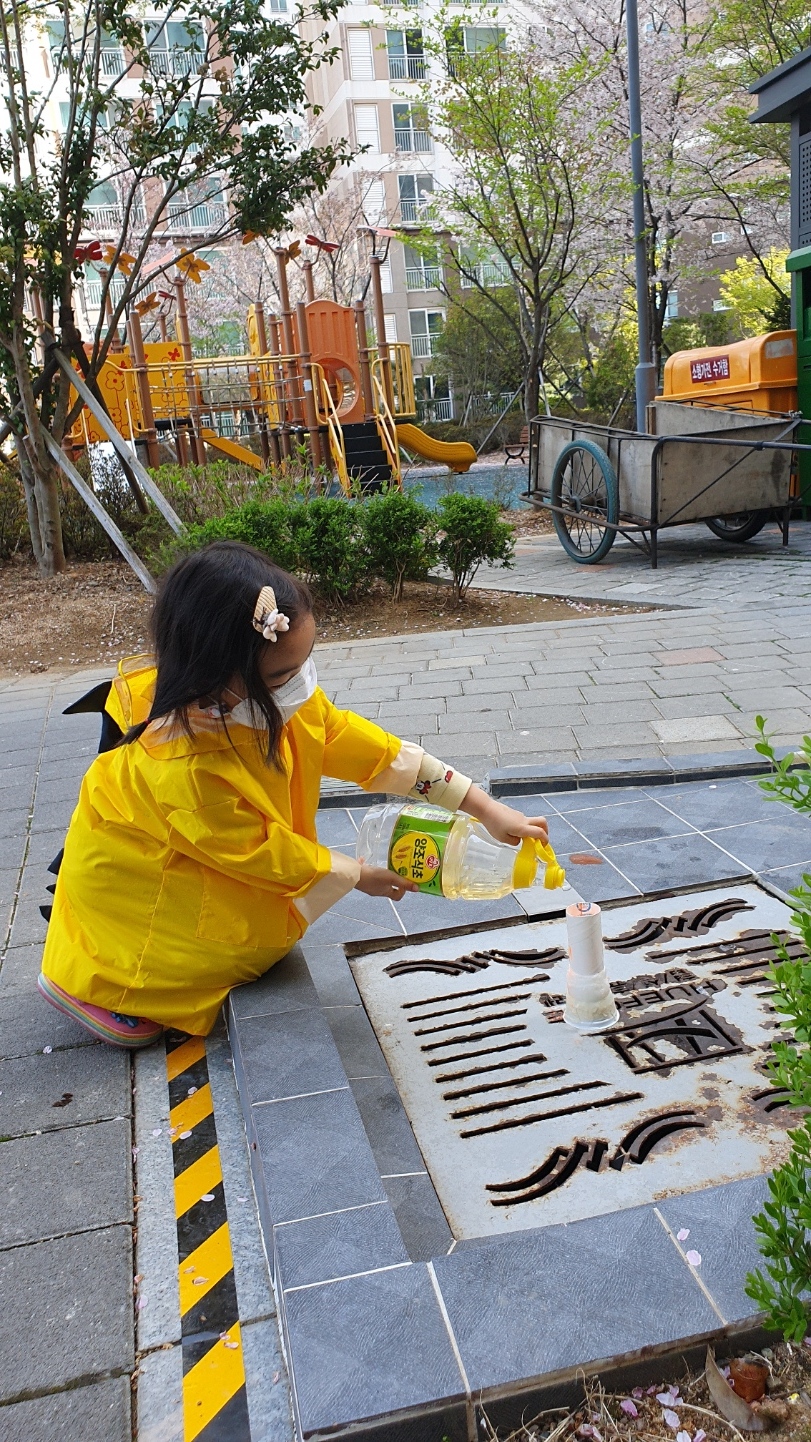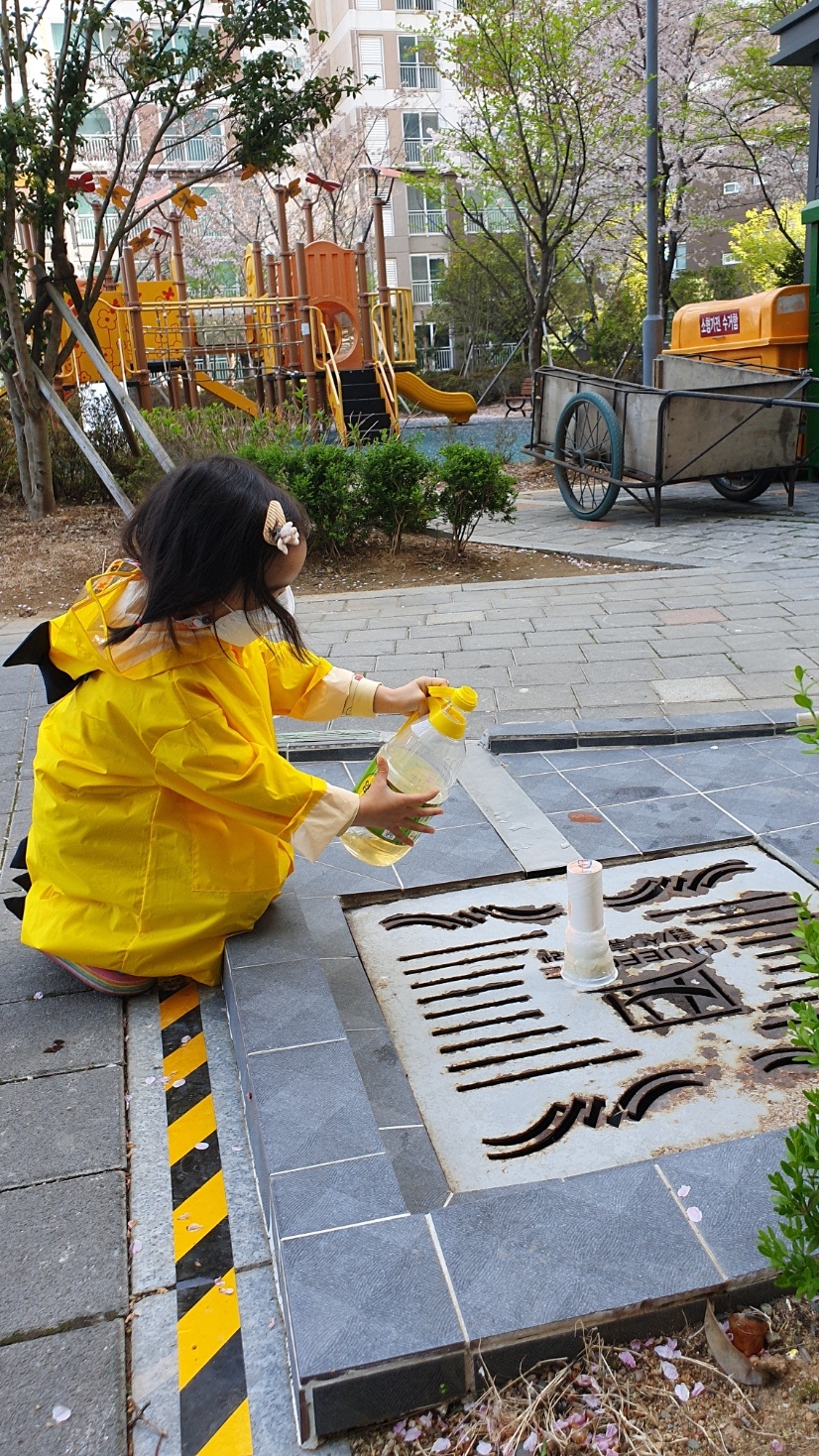 그 안에 베이킹소다를 넣고 화산처럼 물감을 조금 짜놨어요.그리고 식초를 가지고 아파트 밖으로 나와 하수도 근처로 갑니다.저기 가면 저희 동네 아파트는 호수가 있어요.곧 청소하려고 합니다.