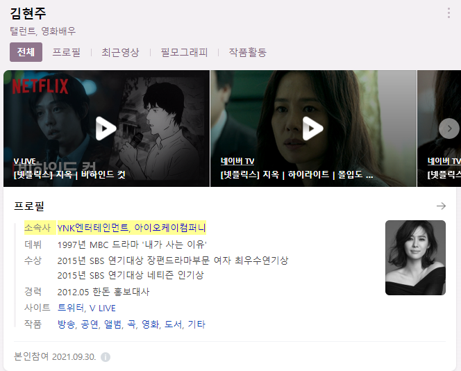 김현주의 소속사를 보면 YNK엔터테인먼트와 아이오케이컴퍼니가 소속사지만 YNK엔터테인먼트도 상장된 회사가 아니므로 아이오케이컴퍼니 쪽을 보면 될 것이다.