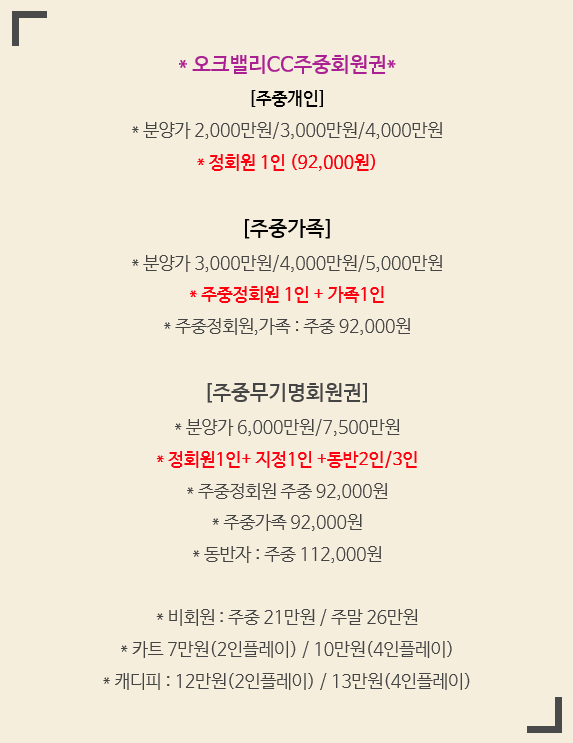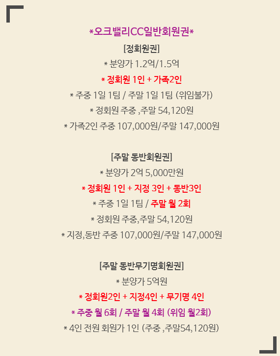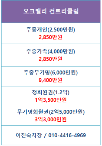 오크밸리cc회원권은 평일회원권이 있고 무기명과 평일무기명의 3종류가 있습니다.평일 정회원 분양가 3250만원 시세는 2500만원입니다.가족회원과 함께 구성될 경우 분양가 4,900만원의 시세는 5,700만원이고 분양가 5,000만원의 시세는 4,000만원입니다.