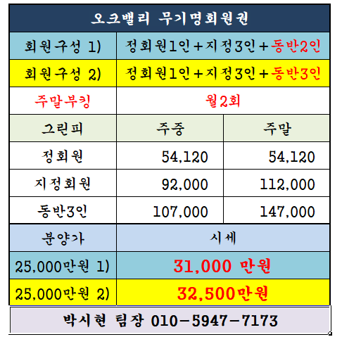 무기명 회원권은 분양가 31,500만원으로 시세는 29,700만원에서 25,000만원입니다.시세가 만기마다 다르니 그 내용은 연락주시면 자세히 상의해드리겠습니다.