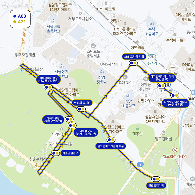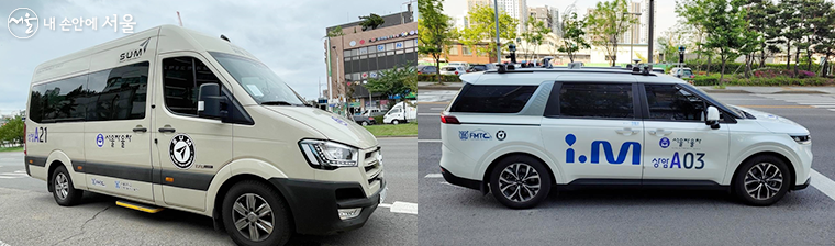 (왼쪽) 상암 A21 노선, 소형 자율주행 버스/(오른쪽) 상암 A03 노선, 승용형 자율주행차 운행 노선은 월드컵경기장역~구룡 교차로~하늘공원로 입구~난지천공원 입구(다목적구장)~하늘공원 입구~월드컵파크4단지~디지털미디어시티역까지 총 7.8km를 운행한다.