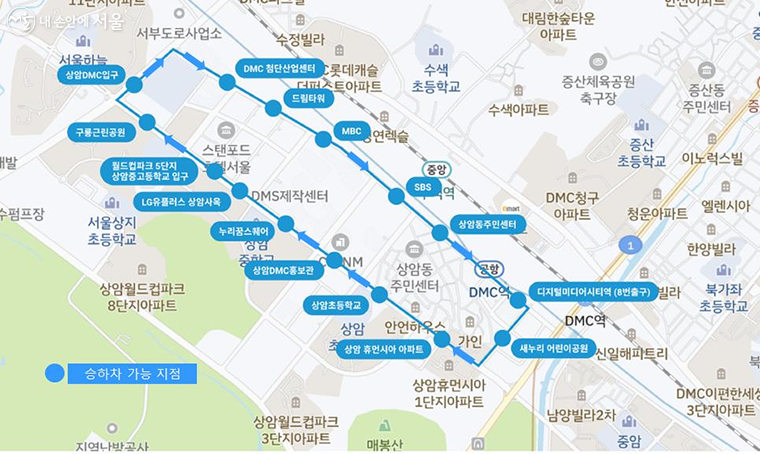 디지털미디어시티역, 누리꿈스퀘어 등 기존에 운행하던 ‘상암A02’ 노선 때는 전국 최초로 휠체어 장애인도 이용 가능한 자율주행차 1대도 운행하며 기존 디지털미디어시티역에서 누리꿈스퀘어, 첨단산업센터 등을 운행하는 ‘상암A02’에 추가 투입된다.