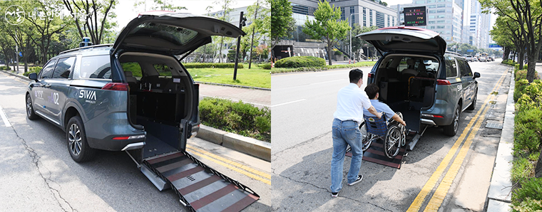 상암 A02 노선에 투입되는 휠체어 탑승이 가능한 자동차 해당 자율차는 휠체어리프트를 장착한 차량으로 기존 장애인 콜택시 차량과 동일한 카니발이다.