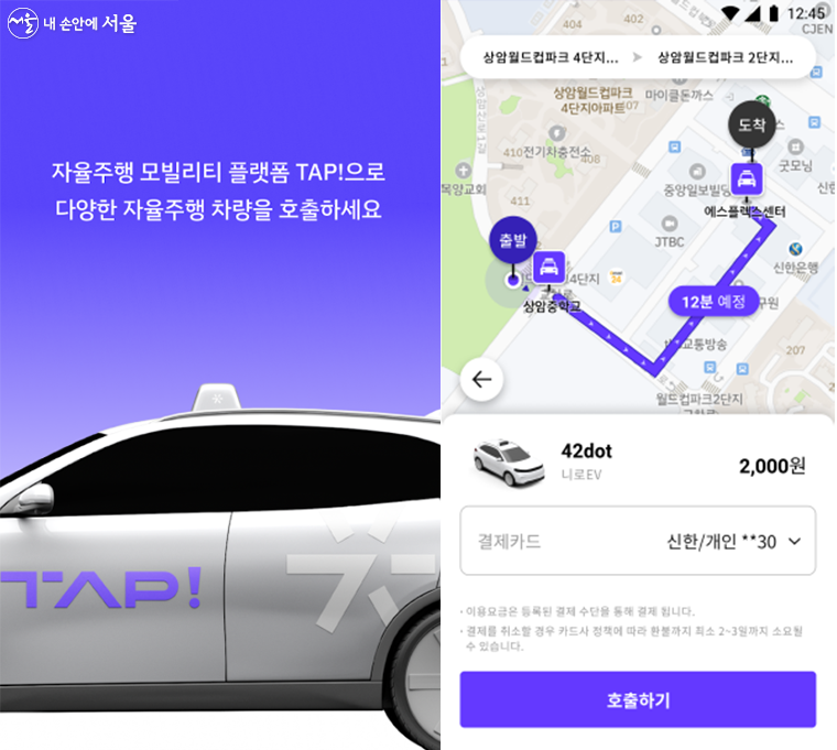 서울 자율주행 전용 스마트폰 앱(TAP!) 화면 자율주행차를 이용하려면 42dot과 민관 협업으로 구축한 서울 자율주행 전용 스마트폰 앱(TAP!)을 구글 플레이스토어와 앱스토어에서 내려받아 이용하면 된다. 회원가입과 함께 결제수단(카드)을 등록하면 시민 누구나 실시간으로 자율주행차를 호출해 이용할 수 있다.