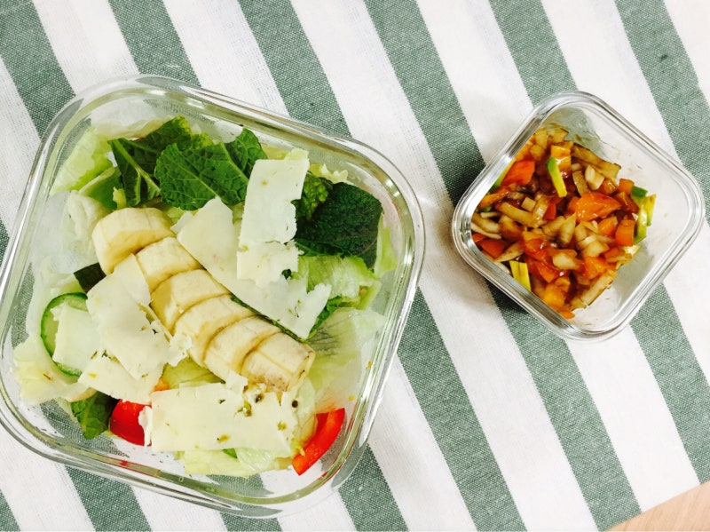 #두부요리 #두부샌드위치 #두부떡갈비 이렇게 먹으면 느끼할 것 같아 아삭아삭한 양배추채를 곁들여 저녁으로 먹을 과일샐러드 도시락도 준비했다.오빠는 여기 계란이랑 우유 추가.