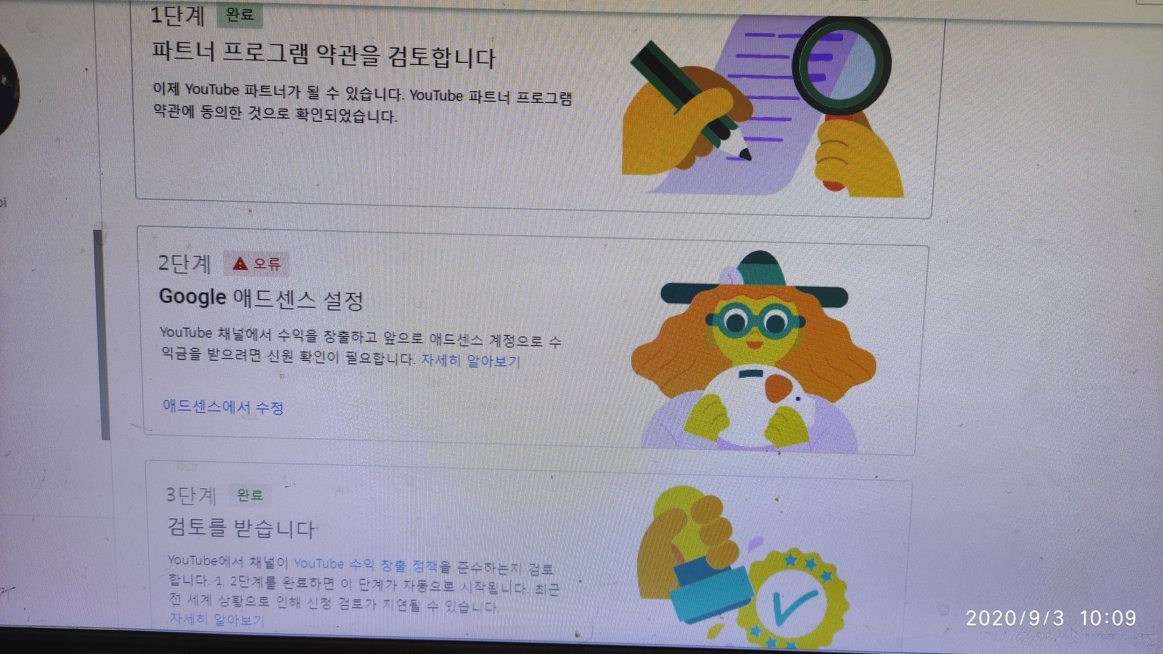 유튜브 어드센스 2단계 거부?수익 창출 단계는 총 3단계로 나뉘는데, 그 중 1단계는 매우 쉽게 통과되었다.