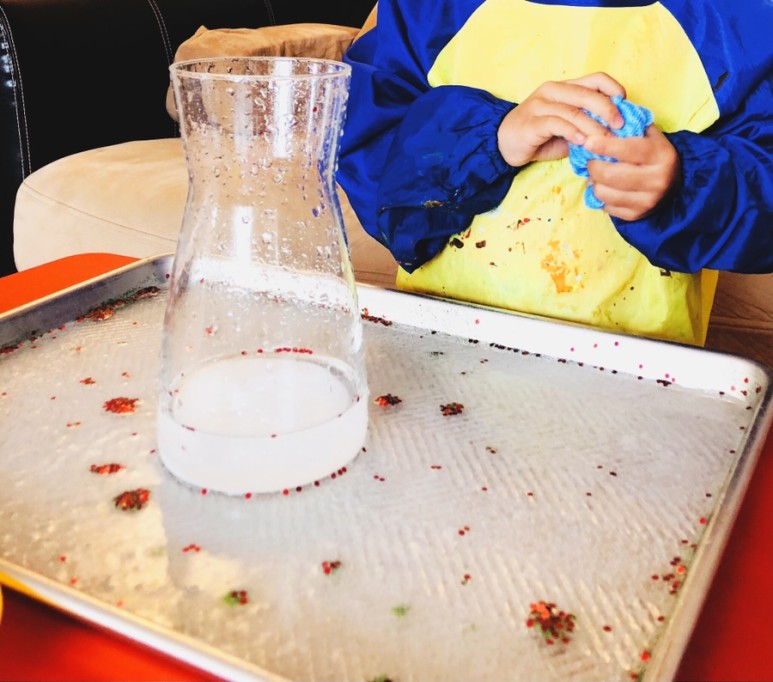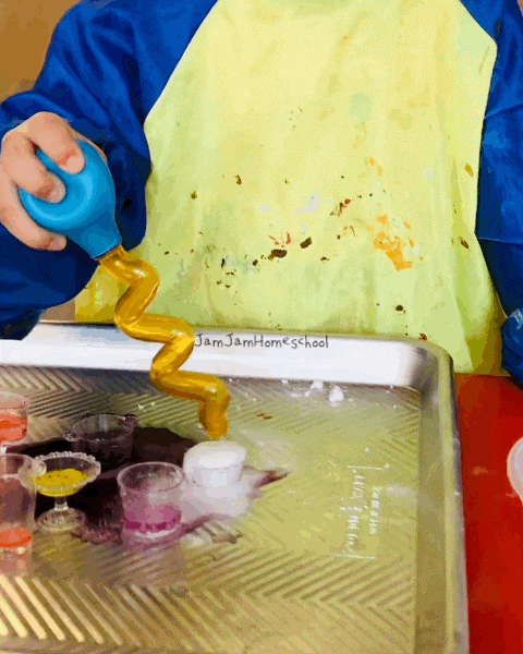 (선택)사랑이는 ‘추가놀이’로 작은 컵에 베이킹소다를 넣고 식초에 식용색소를 넣어 스포이트하게 지우는 놀이를 해봤습니다.