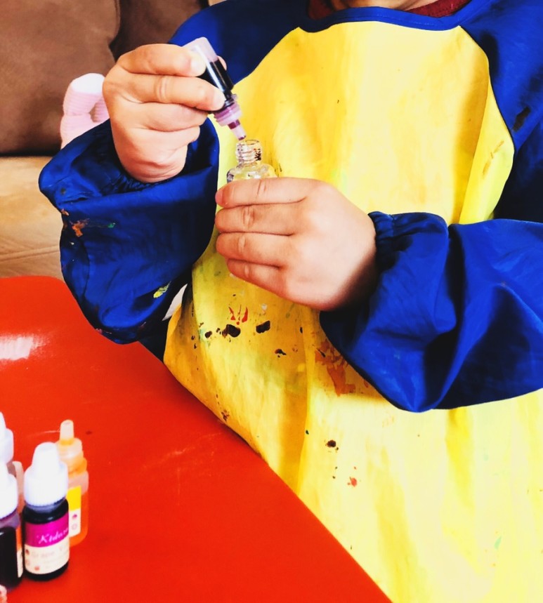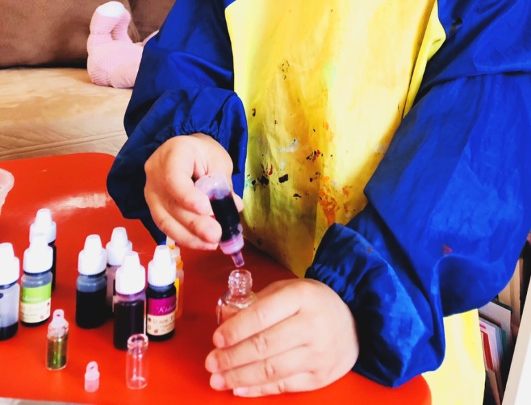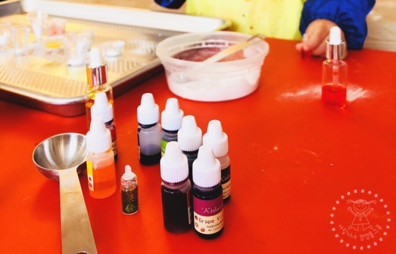 식초를 작은 스포이트 병에 넣고 그 안에 여러 가지 색의 식용 색소를 지워서 알록달록한 식초를 만들어 주었습니다.