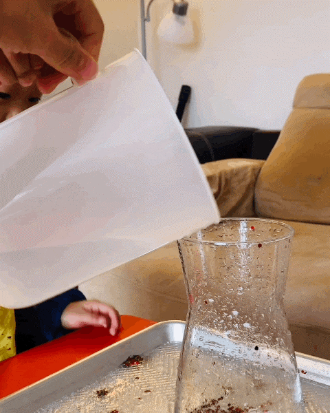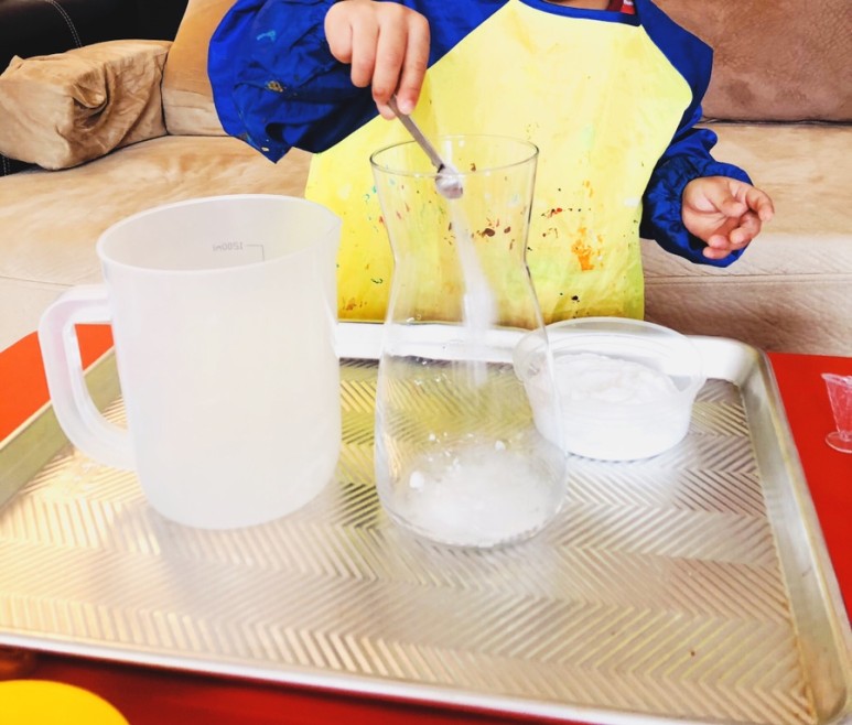 [준비물] 식초, 베이킹소다, 긴유리병 또는 페트병, 쟁반, 스푼, (선택) 스포이트, 작은컵, 식용색소