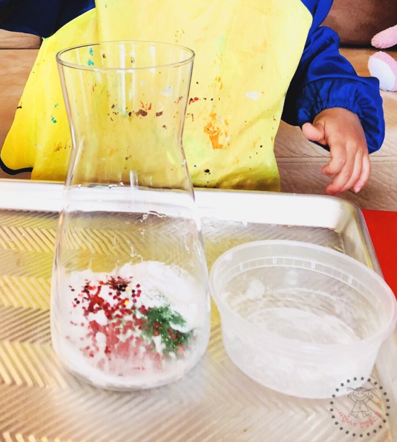 베이킹 소다에 빨강 초록 반짝이를 넣은 모습