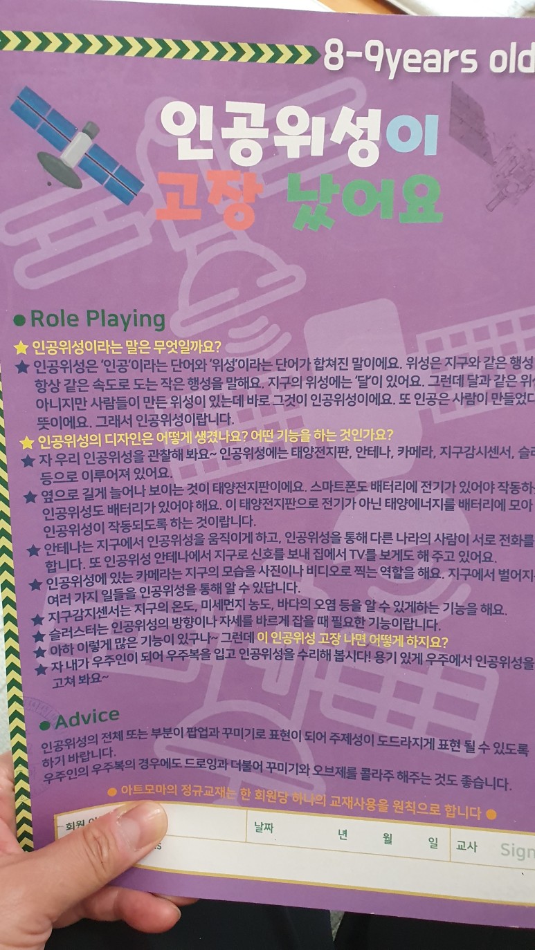 인공위성이 고장났어요.용산 방문 미술 아트모마 지난주에는 일이 있어서 선생님을 만나지 못하고 이번 주에 다시 만나게 되었다. 아이가 얼마나 좋아하는지. 학교 방과후를 하나 더 넣고 싶었는데 아트맘을 꾹! 해야 된다고 해서 방과후에도 못 들어갔다는… ㅠ.ㅠ 방과후도 부럽지 않은 초등미술 아트맘~!