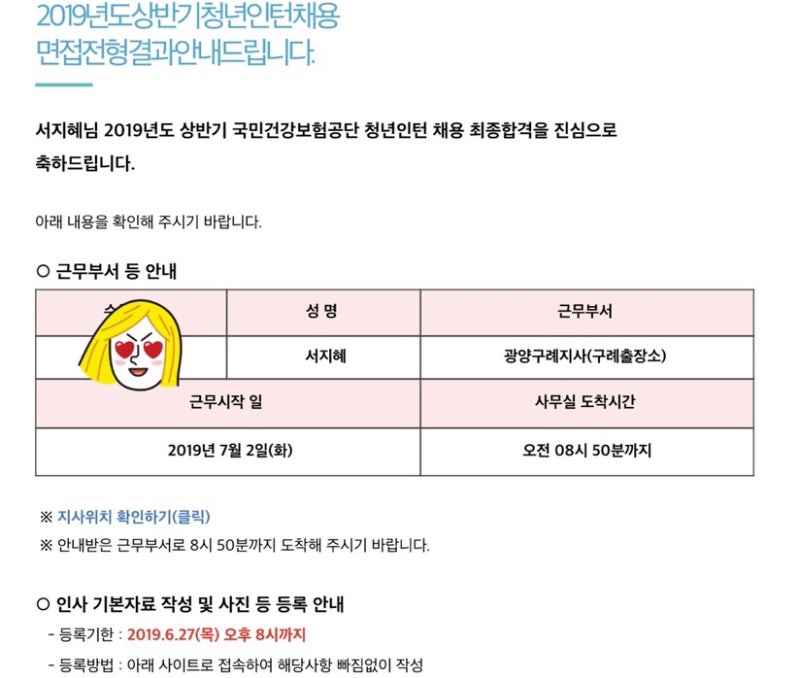 国民健康保険公団青年インターン出張所支援および勤務レビュー健康保険公団青年インターン募集地域を見れば支社、出張所の2つに分かれ、(地域本部採用人員は支社に含む)発令地を見れば地域本部、支社、出張所の3つに分かれることが分かる。地域本部:管轄支社に対する行政管理、包括的な健康保険公団業務支社:行政支援チーム、資格徴収部、保険給付可否、運営センター(長期療養)出張所:出張所、運営センター(長期療養)出張所は加入者資格管理、保険料督促告知、4大保険窓口収納、療養給与費、長期療養業務を担当するが、支社よりは人員が非常に少なく、ある意味基本的な業務だけを担当すると見れば良い。 健康保険出張所青年インターン勤務レビュー初日には出張所所属支社に行って基本教育も受け、社員証も受け取る。 社員証がなければ業務コンピューターにログインもできない個人情報保護の最高峰健康保険公団..☆ この時、支社同期たちと会って番号も交換して親しくなれた。 そして1、2ヶ月に1回くらいは行事や教育などで支社に行くことがあった。初日の午後頃にしばらく行政支援チームのチーム長が出張所に行って挨拶させて下さり、再び知事復帰後に主任に業務関連実務教育も簡単に受けた。 2日目からはすぐ出張所に出勤した!1.担当業務第一に、競争率が低く、青年インターンの加点を積みやすいということ。3倍数なので、ある意味1人を選ぶのに3人以内に入るのがもっと難しいかもしれないが、思ったより知事志願者は非常に多いので出張所志願はそれなりに良い合格戦略だと思う。第二に、様々な業務を少しずつ担当して健康保険について全般的な知識を積むことができるということ。第三に、課長たちから受けるきれいさ。全国民医療保険は1989年に始まり、地域加入者+職場加入者の統合は2000年だが、出張所の場合、地域加入者(?)を以前担当していたが、そのためか主任、代理もいたが、両親に相当する課長も多かった。前の職場をかなり長く通う 退職した年配の青年インターンなのに可愛がられるのも大きな長所だった。 3.健康保険出張所の青年インターン短所健保は正規職、青年インターン共に「定量(スペック)+真心(自己紹介書)」を見る。 そして正規職よりインターン資格証条件がさらに多いが、インターンは筆記を見ないだけに資格証を多く見るようだ。志願当時、コンピューター活動試験は受けたが、結果が出なくてTOEIC900+、韓国史1級だけなので、支社に出せば書類通過が難しいかもしれないと思った。(公企業の準備生ならみんなコムハントを基本に持っているから。。)健保青年インターン出張所志願理由