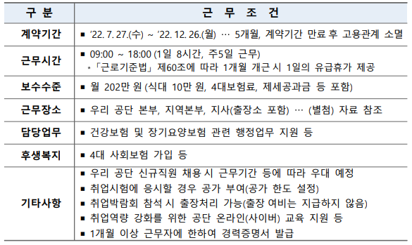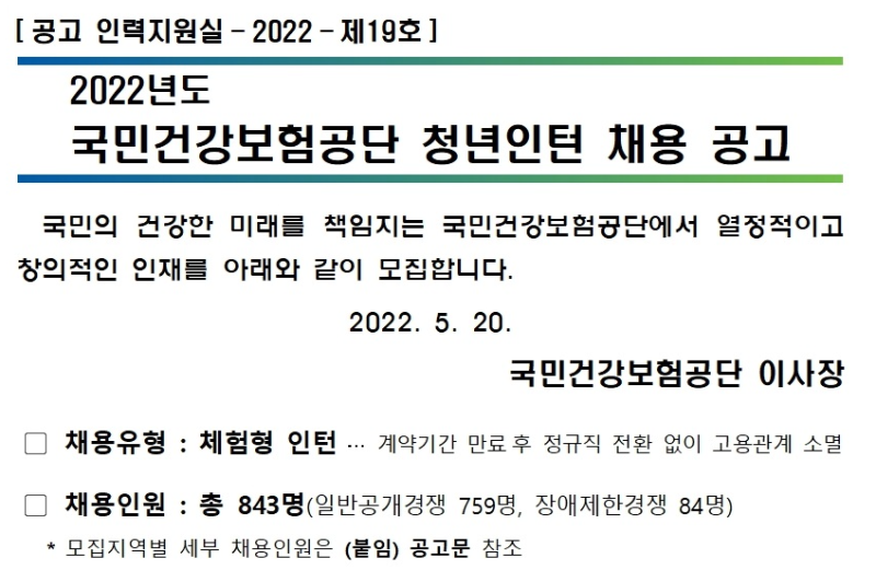 退社後、公企業の就活生として過ごし、空白期を減らすこと、青年インターン加点などのために勤務期間が4ヵ月以上の青年インターンを必ずやりたかった。他の公共機関の青年インターンは少数の人員であるのに比べ、国民健康保険の青年インターンは膨大な採用人数を誇る。直近の21年下半期の青年インターン募集公告を見ても、一般公開競争の場合540人を採用する。健保青年インターンは募集地域別に志願して書類で3倍数を合格させるが、公告によれば募集地域別配置予定部署も出てくる。 健康保険青年インターン募集地域