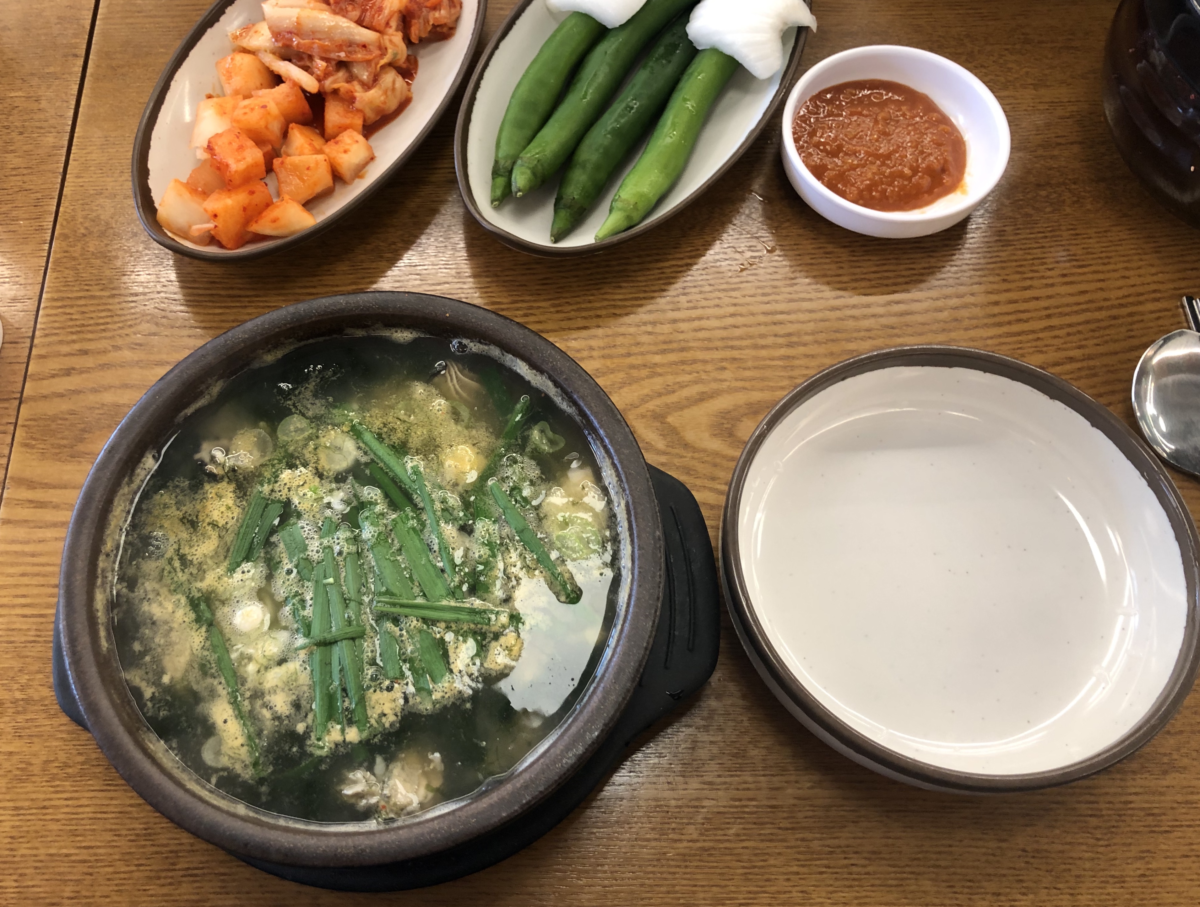 매생이 굴 솥밥과 굴 국밥을 하나씩, 그리고 내가 좋아하는 굴과 부추전을 주문하고 식탁에 놓인 배추김치와 깍두기를 접시에 담는다.