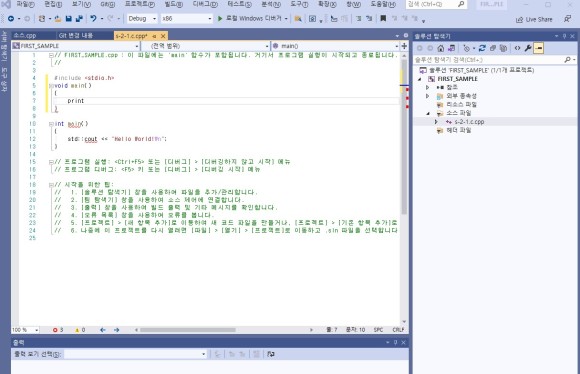 가장 기본적인 새로운 프로젝트를 만들어 소스 파일을 만들어 C언어를 작성해 본다.C 언어 첫 작성 시 #include와 void main()은 기본적으로 작성한다고 한다.그 후 printf는 출력을 이용하는 언어인데 원하는 C언어를 작성하고 printf를 작성하여 명령어를 입력하면 출력 기능이 cmd로 나타난다.