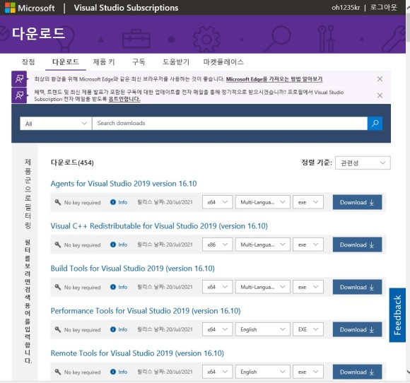 아직 C 언어의 기초독학도 하지 못한 나는 Visual Studio의 차이와 익스프레스의 차이, 그리고 C 언어와 C++의 차이도 모른다.그래서 그냥 컴틴 동영상에서 시키는 대로 하려고 했더니 2010 버전은 이미 멀리 서비스 팩으로만 운영 중이고 2019 버전이 최신 버전이라 최신 버전으로 다운받았다.