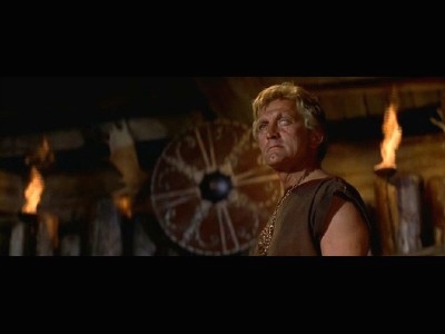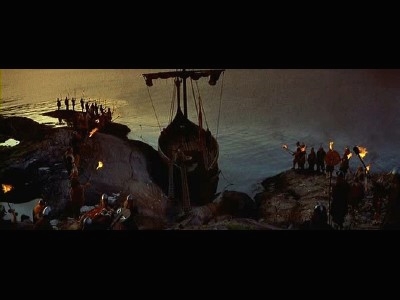 바이킹으로서 명예롭게 죽으려고 라그나(어네스트 보그나인)에게 칼을 쥐어준 에릭(토니 커티스)의 왼손을 잘라 배에 실어 날린다.