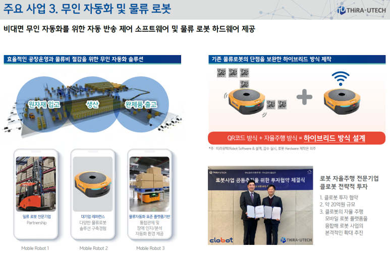 티라유테크의 스마트팩토리 솔루션과 창고자동화 솔루션 결합, 로봇을 활용하는 턴키 솔루션을 고객에게 제공하고 세계 시장 진출을 위해 미국에서 열리는 2023년 국제물류대전(PROMAT) 참가를 추진 중이며 성장 잠재력을 살리기 위한 투자 유치도 진행할 예정이다.