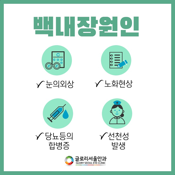 이 밖에도 평소 근거리 작업을 할 때 돋보기 사용을 해야 했는데, 갑자기 돋보기 사용을 하지 않아도 근거리 활동이 가능해질 수도 있습니다. 검은 눈동자에 흰 이끼가 끼면 하얗게 변하는 경우도 있습니다. 그러나 백내장은 노화로 인해 발생하지만 노화 이외에도 다양한 원인에 의해 발병하고 있어 증상을 통해 확인하는 것이 적절합니다. 그렇다면 백내장의 원인으로 어떤 것이 있는지 알려 주실 수 있습니까?