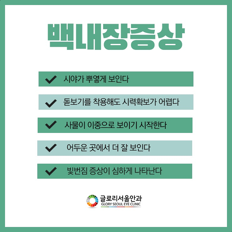 나이가 들어 백내장이 발병하여 실명에 이르면 일상생활에서 불편함을 동반할 뿐만 아니라 정상적인 생활을 영위하기 어려워질 수 있으며, 아래와 같은 증상이 나타난 경우 의료기관에 신속히 내원하여 눈의 상태를 정밀하게 관찰한 후 이를 바탕으로 시력교정해 보는 것이 적절합니다.