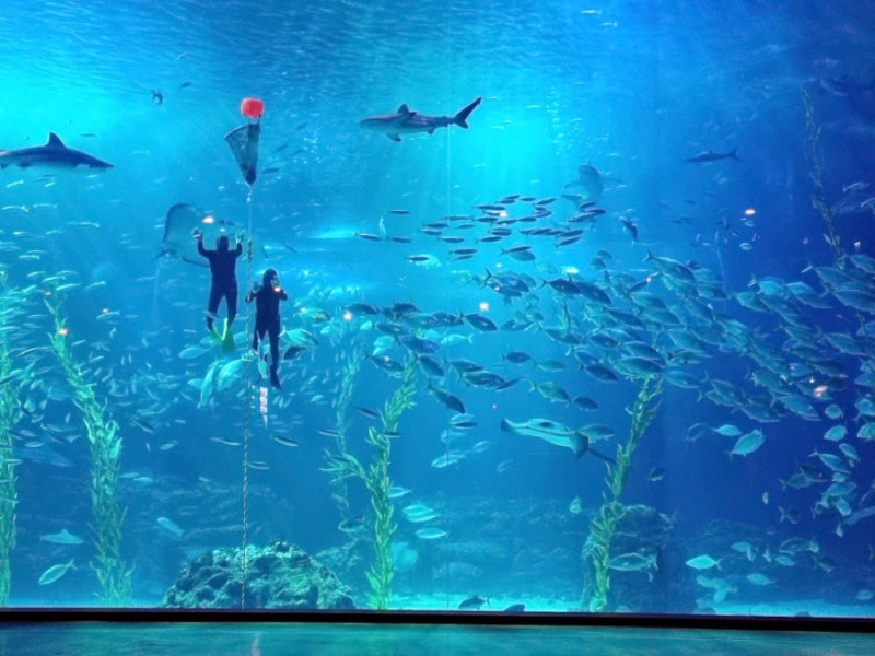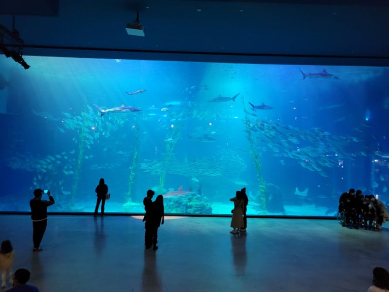 티켓을 구입했습니다! 하지만 꽤 비싸네요. 어쨌든 안으로 들어가니 큰 수조가 보이는데 아쿠아리움 직원이 수조안을 청소하고 있었습니다. 이렇게 큰 수조안에 들어가서 청소하는 모습을 보니 정말 수고하셨습니다.