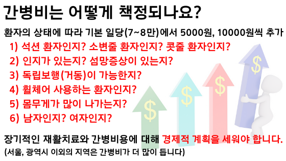 간병인이 병원에 케어를 하러 오면 환자 케어뿐만 아니라 식사 시간에 식사를 보조하거나 재활하는 운동을 보조해 주고 거동이 불편한 환자를 위해 위생적으로 관리도 도와주기 때문에 간병인 분들이 하시는 경우가 굉장히 많습니다.이렇게 환자를 위해서 도와주시는 경우가 많기 때문에 아무래도 비용적인 부분에서도 생각보다 많이 나오게 됩니다.