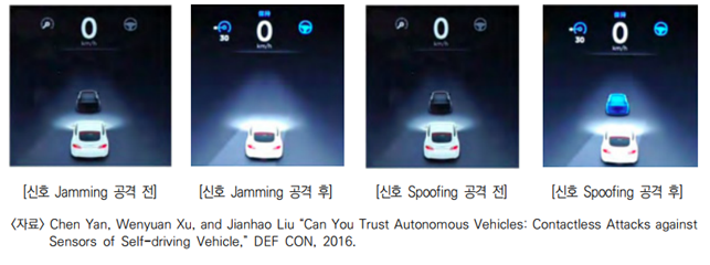 B. 지능형 운전 지원 시스템(Advanced Driver Assistance System:ADAS)-자동 운전의 기반이 되고, 감지 센서와 GPS, 통신, 지능형 장비 등을 이용하여 주행 중에 자동차가 스스로 주변 환경을 인식하고 판단을 내리는 시스템-ADAS센서 결합 정도로 분류되고 ADAS는 인지, 판단, 제어 등 3단계로 구성 1)인지 단계-센서로부터 데이터를 수집하는 단계-Radar, LiDAR, Camera등의 인지 센서로부터 외부 환경의 정보를 수집하고 가공 2)판단한 정보를 통해서 적절한 움직임을 수집한다. 사각 지대 및 환경적 영향으로 발생할 수 있는 인지 오류를 보완하기 위해서 실시간 도로 환경 정보를 제공하는 정밀 지도와 다른 자동차 정보를 알 수 있는 Vehicle to Everything(V2X)통신 정보를 결합하여 정확한 주행 정보를 계산 3)제어 단계-판단 단계에서 내려진 결정을 실제로 구현하는 단계-집행 기관 등을 통해서 속도를 조절하거나 방향 제어 및 제동 등에서 직접적인 움직임을 관할한다. 자동 운전 자동차의 센서를 대상으로 한 여러 취약성 분석 발표-자동 운전 기술은 교통 사고 감소, 운전자의 편리성 향상 등의 긍정적인 요소가 존재하지만 자동 운전 자동차에 대한 사이버 공격 가능성이 존재-자동 운전 자동차의 주행 상황 인지 과정에서 치명적인 오류를 발생시킬 가능성이 있고, 이로 인한 인명 피해와 경제적 피해가 발생할 수 있는 2.Radar센서 공격자. 개념-자동차에 자동 긴급 제동 제동 기능과 차선 유지 기능을 지원하기 위해서 사용한다. 원리-전자파를 방출하고 수신하는 기본 원리로 작동하고 Time-of-Flight시간을 측정하고 장애물과의 거리를 측정한다. 공격-재밍(Jamming)공격 및 스푸핑(Spoofing)공격 1)레이더 센서에 대한 재밍 공격-재밍 공격은 레이더 센서를 통해하고 탐지된 물체를 Tesla Autopilot시스템에서 사라질 수-재밍 공격을 수행하기 위해서 레이더 센서가 발생하는 같은 주파수 내 76~77GHz(Tesla기준)을 생성하고 공격을 수행 2)레이더 센서에 대한 스푸핑 공격-주변에 존재하는 장애물과 측정 거리를 변조-레이저 센서에서 발생하는 비슷한 무선 신호를 이용하고 스푸핑 공격을 수행하고 테슬라와 주기적 거리를 실시한다. LiDAR기반 인식에 대한 적대적 센서 공격-단순 신호 스푸핑 공격으로 물건 인식 자리를 더욱 멀게 또는 더 가까이 판단하도록 유도-적대적 모델(Adversarial Example)생성 방법을 이용한 공격에서 가짜 장애물(fakeobject)을 통해서 실험 자동차의 비상 브레이크를 작동시키는 공격이나. 카메라와 LiDAR에 보이지 않는 사례-임의의 센서에 대한 에러 주입 공격에 대응하기 위해서 복수의 센서 값을 동시에 활용하고 자동차 주변의 도로 상황을 인지하는 센서 퓨전 기술이 자동차에 적용-카메라 센서와 LiDAR센서를 사용하고 기물을 인지하는 센서 퓨전 기술에 대한 공격 4.Vision(Camera)센서 공격이. ADAS의 팬텀-탑재된 카메라 센서에 의해서 탐지된 물체가 실제 이미지인가 빛으로 투영된 가짜 이미지(Phantom)인지 분류할 수 없는 문제-휴대용 프로젝터를 통해서 팬텀으로 불리는 홀로그램 이미지와 가짜 교통 표지판을 테슬라 자동차에 투영한다. 안전성의 문제 발견-차로 탐지 모듈이 차선을 잘못 인식하게 가짜 차선을 생성하는 공격이다. 더티 로드 공격 가능(Dirty Road Can Attack)-Automated Lane Centering(ALC)시스템에 오작동을 유발하는 공격[참고]자동 운전 자동차의 센서 공격 모델