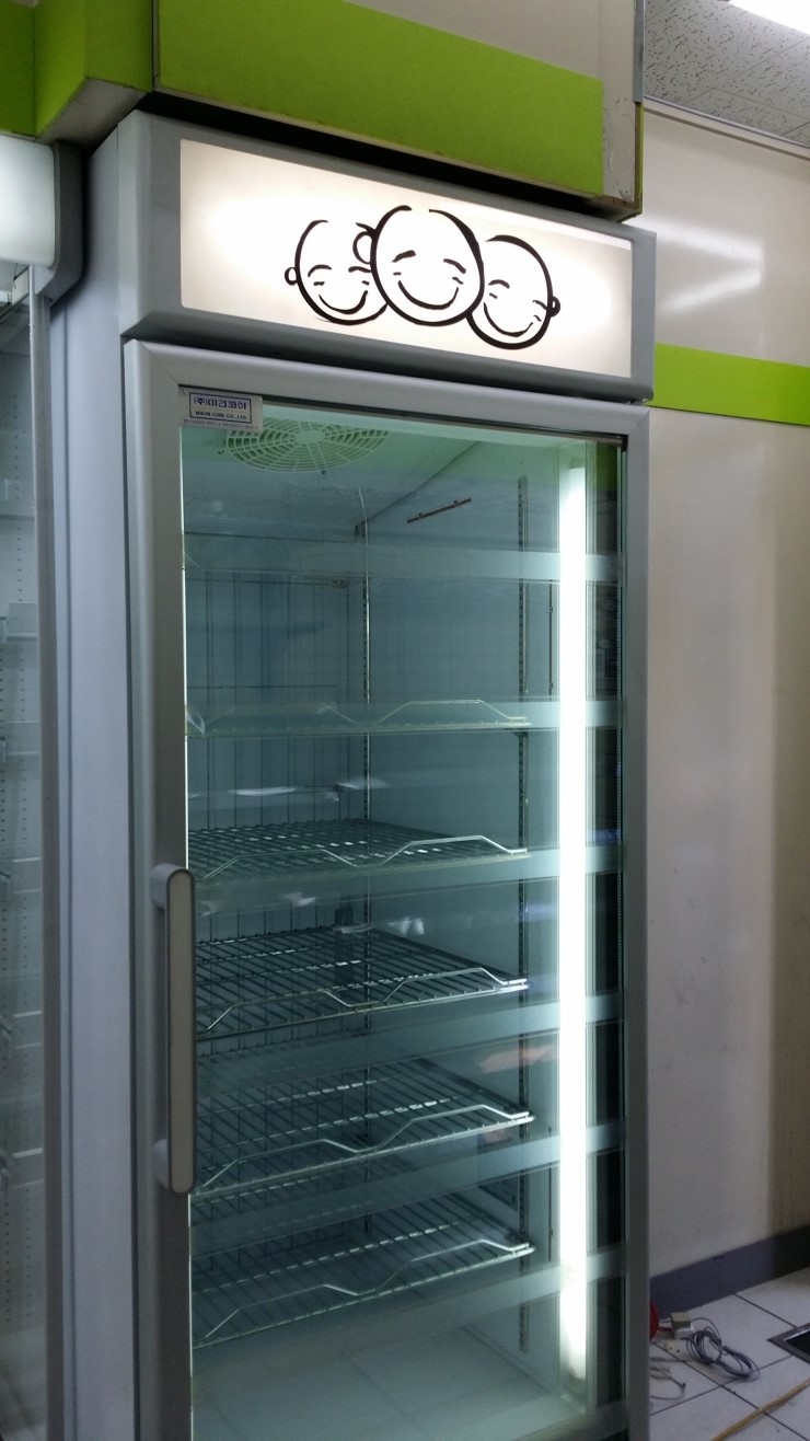 주변 모습과도 잘 어울리죠?너무 튀지도 않고 무난한 색상이라 더 좋을 것 같아요.양문형이므로 앞으로도 뒤로도 여닫을 수 있는 형태입니다.이런 걸로 해야 손님도 물건을 보고 직접 꺼낼 수도 있고 직원들도 물건을 편하게 넣을 수 있어요.LED는 분홍색으로 되어 있습니다.불을 켠 사진은 찍지 않았네요.제작해서 만든거라 더 예쁘게 된거 같아요.처음에는 어떻게 구입해야 할지 정말 걱정이었는데 다행이네요.