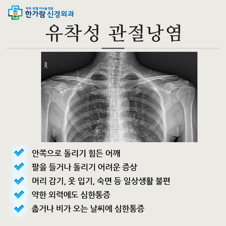 오십견이라는 이름 대신 유착성 관절낭염이라고 불리는 것은 관절낭이라는 곳에서 염증이 생기고 이것이 부풀어 올라 관절과 유착 증상을 일으킨다는 것입니다. 관절낭은 관절을 둘러싸고 있는 피막으로 이런 부위에서 이상이 발생하기 때문에 관절의 가동범위 제한이 크게 나타나게 됩니다. 하지만 특이한 증상이라면 질환 초기에는 움직임 제한이 크지 않았지만 시간이 지날수록 더 커진다는 겁니다.