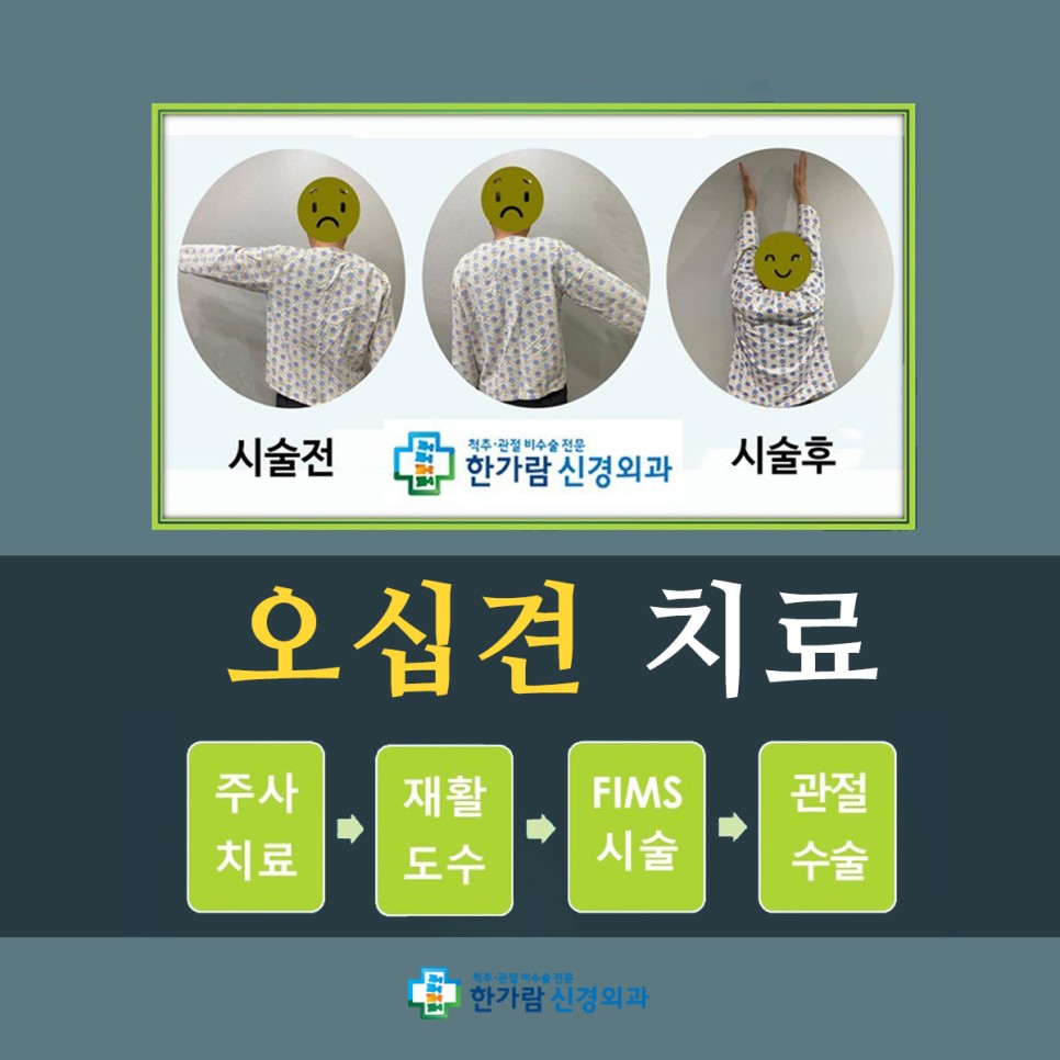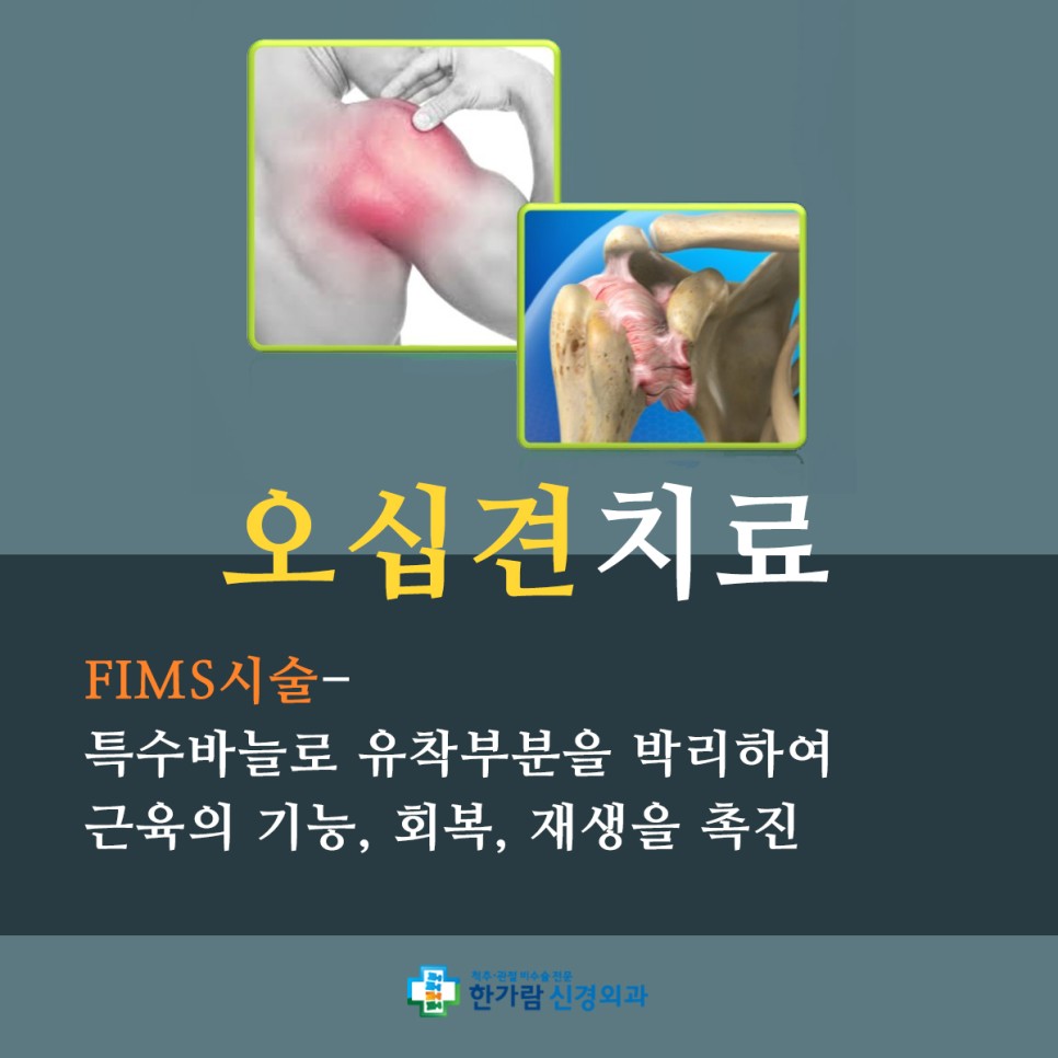 유착성 관절낭염의 보존적 치료는 약물치료, 운동치료, 도수치료, 주사치료 등이 이루어집니다. 이러한 치료를 통해 신체 스스로 회복하는 것을 유도하게 되는데, 이러한 치료를 진행함에도 불구하고 호전이 보이지 않는 경우 비수술적 치료를 고려할 수 있습니다. 대표적으로 FIMS 시술이 이뤄지는데, 이 치료법은 의료용으로 특수 제작된 끝이 단단한 바늘을 어깨에 찔러 유착 부위를 박리시켜 주변 혈액순환을 개선하는 치료법입니다.