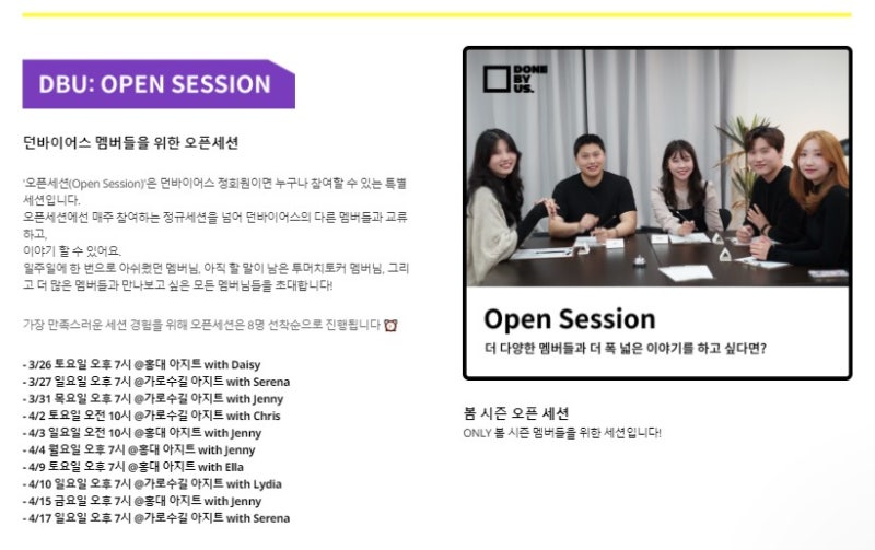 다른 스터디 그룹과 차별화되는 댄 바이어스의 장점은 매우 체계적이라는 것이다. 주 1회, 2시간 30분 동안 세션이 진행되는데 각 세션의 진행 순서가 정해져 있다.먼저 mini-activity를 통해 가볍게 입을 푼다. 그 다음 영어로 즉석에서 말하고 생각하는 연습을 하며 다양한 영어 표현/신조어를 배운다. 그리고 매주 다양한 main activity 진행 후 리더의 피드백을 받는다.그동안 다른 영어회화 스터디에 참여하면서 짜여진 틀이 없어 뒤죽박죽이 되는 경우도 많았다. A 주제에 대해 이야기해야 하는데 대화를 하다 보면 점점 산에 가거나 시간 배분에 실패해서 하나의 주제만 계속 이야기하게 된다 등등. 또 모두에게 공평한 발언 기회가 돌아간다기보다는 말하는 사람만 계속 말하고 파워내향형인 나는 고개를 끄덕이고 돌아온 적도 있다. 내가 영어회화 스터디 그룹에 갔는지 경청회에 갔는지 알고 현자 타임에 다녀왔다.하지만 댄 바이어스는 이런 게 없다. 모임을 이끄는 리더가 시간 배분/발언 기회 배분을 아주 잘해준다. 즐겁게 대화하면서도 시간이 너무 오버할 것 같으면 적당히 마무리해주고, 각 활동에서 누구나 한 번쯤은 이야기할 수 있도록 중재해준다.덕분에 따로 나오지 않아도 자연스럽게 이야기할 수 있게 됐고 세션 진행도 다양한 활동으로 물 흐르듯 이어졌다. 댄 바이어스의 이런 체계적인 점이 너무 마음에 들었다. 장점2. 신선하고 재미있다댄 바이어스에서 체계적인 것 못지않게 중요한 장점은 바로 재미있다는 것이다. 체계적인 것도 당연히 중요하지만 솔직히 영어학원 수업도 체계적이다. 직장인 영어회화 스터디 그룹에 나가는 이유는 학원 수업보다 자유롭고 즐겁게 영어를 공부하고 싶어서가 아닐까?내가 참여한 댄 바이어스의 11월 세션 주제야. 처음부터 MBTI… 너무 흥미로워 ㅋㅋ 인터넷에 떠도는 MBTI 화상을 보면서 영어로 대화하니까 신선하더라. 두 번째 세션에서는 미국 TV쇼를 보며 미니게임을 했고, 세 번째 세션에서는 ‘카카오톡 읽기 vs 안 읽고 뭐가 더 기분 나쁘냐?’와 같은 밸런스 게임을 했다. 영어로 친한 친구들과 수다를 떠는 느낌이라 너무 즐거웠다.그렇다고 가벼운 활동만 있는 것은 아니다. ‘성노동은 합법화돼야 하는가?’, ‘예술 vs 기술, 무엇이 더 인간답게 하는가’ 등 진지한 주제로 대화를 나누기도 했다.중요한 것은 전반적인 모든 과정에서 재미를 느낄 수 있었다는 것이다. 아무래도 던바이어스주의 연령대가 20~30대와 비슷한 나이였고, 다양한 배경과 직업을 가진 사람들이 모여 다채로운 의견을 들을 수 있었다. 장점3. 자연스럽게 영어회화 시험을 준비할 수 있다.댄 바이어스로 2시간 이상 자유롭게 영어로 대화하다 보면 자연스럽게 영어회화 시험 준비가 될 것 같았다. 실제 댄 바이어스 참여 이유가 OPic 취득이 목표인 경우도 많았다. 나 역시 꾸준히 직장인 영어회화를 다니면서 내친김에 옵/토스를 준비하려는 목적도 있다. 댄 바이어스에서도 이를 알기 때문인지 3주차 세션에는 <1초도 쉬지 않고 영어로 1분간 말하기> 챌린지가 있었다. 처음에는 한국어로도 1분 동안 쉬지 않고 말하는 것이 힘들지만, 영어로 어떻게 하지…라고 생각했는데 막상 해보니 가능하더라? 하하 오픽 시험에서도 발화량이 중요해 망설이지 않고 높은 점수가 나온다고 하는데 이런 챌린지를 통해 자연스럽게 오픽 스피킹을 연습해볼 수 있었다. 댄 바이어스를 3개월 동안 수강하고 오픽 시험을 보는 건 어떨지 궁금해.단점1.하나의주제,문법/독해중심을원한다면노노이제 댄 바이어스의 단점에 대해 이야기해 보자.가장 먼저 떠오르는 것은 깊이 있는 이야기가 어렵다는 점이다. 댄 바이어스는 팀당 8명 안팎의 소수 인원으로 구성되지만 당연히 일대일 회화 수업이나 전화영어처럼 긴 대화는 어렵다.그런데 생각해보면 일대일 전화영어는 보통 15~25분 정도인데 댄 바이어스에 한번 참여할 때 최소 20분 이상은 얘기해오기 때문에 이건 큰 차이가 없을 수 있다. 일대일&다수의 차이에서 오는 발화량 외에도 하나의 주제로 깊이 있는 공부를 하고 싶다거나 문법/독해처럼 아카데믹한 영어를 배우고 싶은 분들에게도 맞지 않을 수 있다. 댄 바이어스는 아무래도 다양한 주제로 실생활에서 사용할 수 있는 표현 위주로 공부하기 때문이다. 단점2. 유료수강벽둘째, 누군가에게는 월 15만원이라는 돈이 부담스러울 수 있다. 나도 지금까지 무료로 직장인 영어 회화를 다녔는데 유료 결제를 하려니 조금 망설였다. 그런데 막상 직접 가보니 가격 대비 얻어가는 게 더 많다고 느꼈다. 또 오픈 세션이나 다양한 이벤트 세션에 참여하면 시간당 1만원꼴이어서 전화영어와 비교해도 가격적인 면에서 오히려 저렴하다는 생각이 들었다.이런 건 역시 직접 해봐야 알 수 있는 부분이라 댄 바이어스라도 1회 체험권이 있으면 좋을 것 같아.둘째, 누군가에게는 월 15만원이라는 돈이 부담스러울 수 있다. 나도 지금까지 무료로 직장인 영어 회화를 다녔는데 유료 결제를 하려니 조금 망설였다. 그런데 막상 직접 가보니 가격 대비 얻어가는 게 더 많다고 느꼈다. 또 오픈 세션이나 다양한 이벤트 세션에 참여하면 시