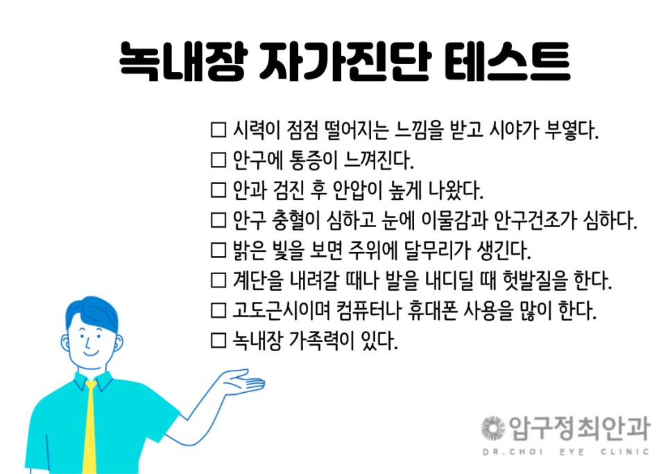 □시력이 점점 떨어지는 느낌에 시야가 뿌옇다.□안구에 통증을 느낀다.□안과 검진 후 안압이 높다.□ 안구충혈이 심하고, 눈에 이물감이나 안구건조증이 심하다.□밝은 빛을 보면 주위에 달이 생긴다.□계단을 내려올 때나 발을 내딛을 때 헛스윙을 한다.□고도 근시로 PC나 휴대 전화의 사용을 많이 한다.□녹내장 가족력이 있다.안과의사 최승일의 눈이야기