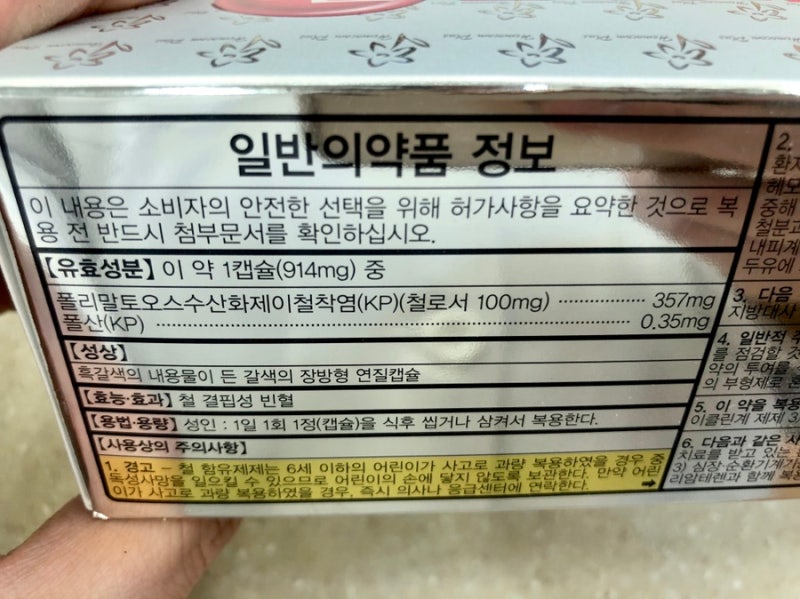 レオパパのブログで鉄分剤に関するポストを見た方は覚えていると思いますが、鉄含有製剤は6歳以下の子供が事故で過量服用時に中毒性死亡を起こす可能性があります。そのため、お子様の手に触れないように注意して保管してください。 お子様が摂取または服用できる鉄分剤が別にあります。 任意で成人用鉄分剤を服用させてはいけません。子供の鉄分剤は専門家に相談してください!鉄分剤を服用すると、便が黒色に変わることがあります。 これは鉄分剤に含まれる鉄分の80パーセントから多くは90パーセントが便から排出されるものなので、心配する必要はありません。 胃腸障害が発生した場合、食後に服用したり胃腸薬と一緒に服用することができますが、食べ物によって鉄分の吸収率が低下することがあります。 他にも緑茶、牛乳、コーヒー、制酸剤などと一緒に服用すると吸収率が下がることがあります。今日はレオパパと一緒に鉄欠乏性貧血に服用する日洋薬品ヘモコムプラスカプセルについてご紹介しました。 ヘモコンプラス軟質カプセル1箱には60カプセルの小さな箱が2つ入っています。1日1カプセル服用なので、大箱は4ヶ月分、小箱は2ヶ月分です。 ヘモコムプラス軟質カプセルについてもっと気になる点があれば、レオパパにネイバートークトークやプラストークしてください。週末の寒さが厳しいです。 どうも。